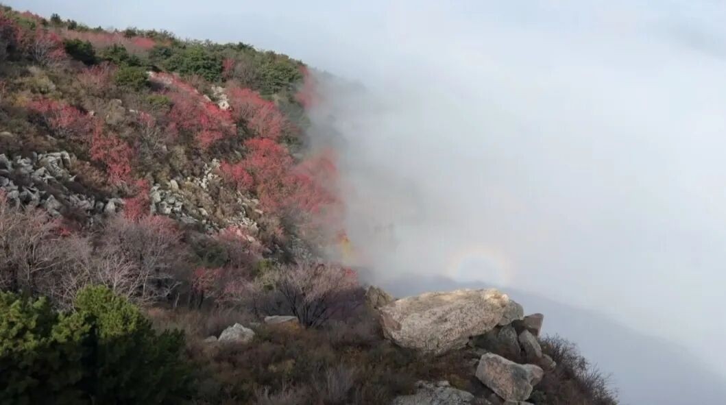 泰山尧观顶现“宝光” 奇观 光的衍射与云雾共舞