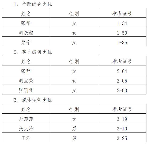 三、根据笔试成绩,由高分到低分按各岗位招聘人数1:3的比例,确定进入面试范围人选如下: