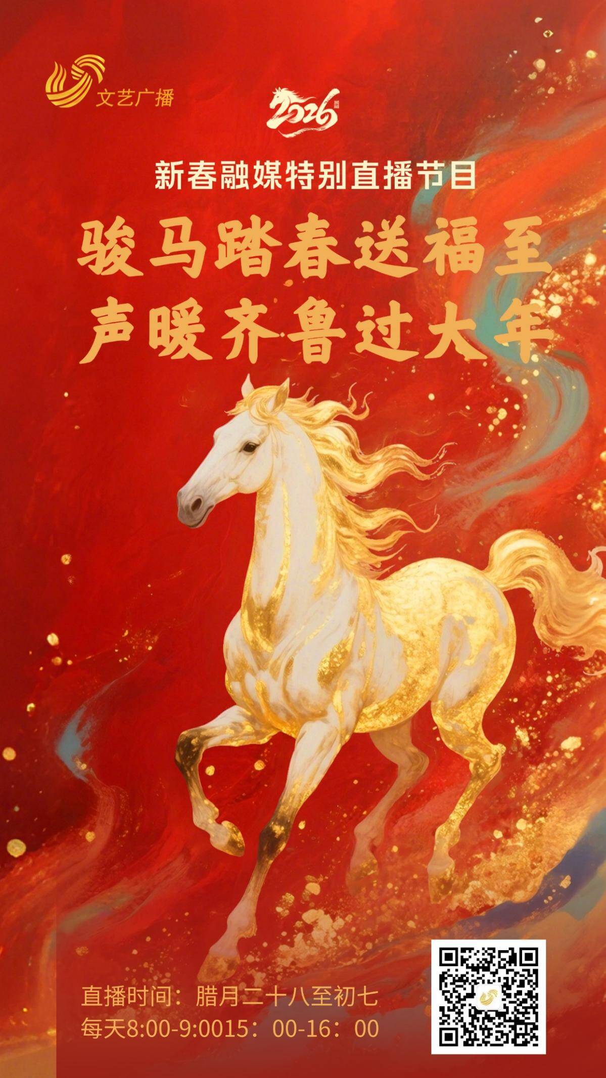 山东广播电视台文艺广播春节期间特别策划“骏马踏春送福至 声暖齐鲁过大年”融媒主题新春特别直播节目。从腊月二十八至大年初七(2月15日—2月23日)每天8:00—9:00,15:00—16:00播出。